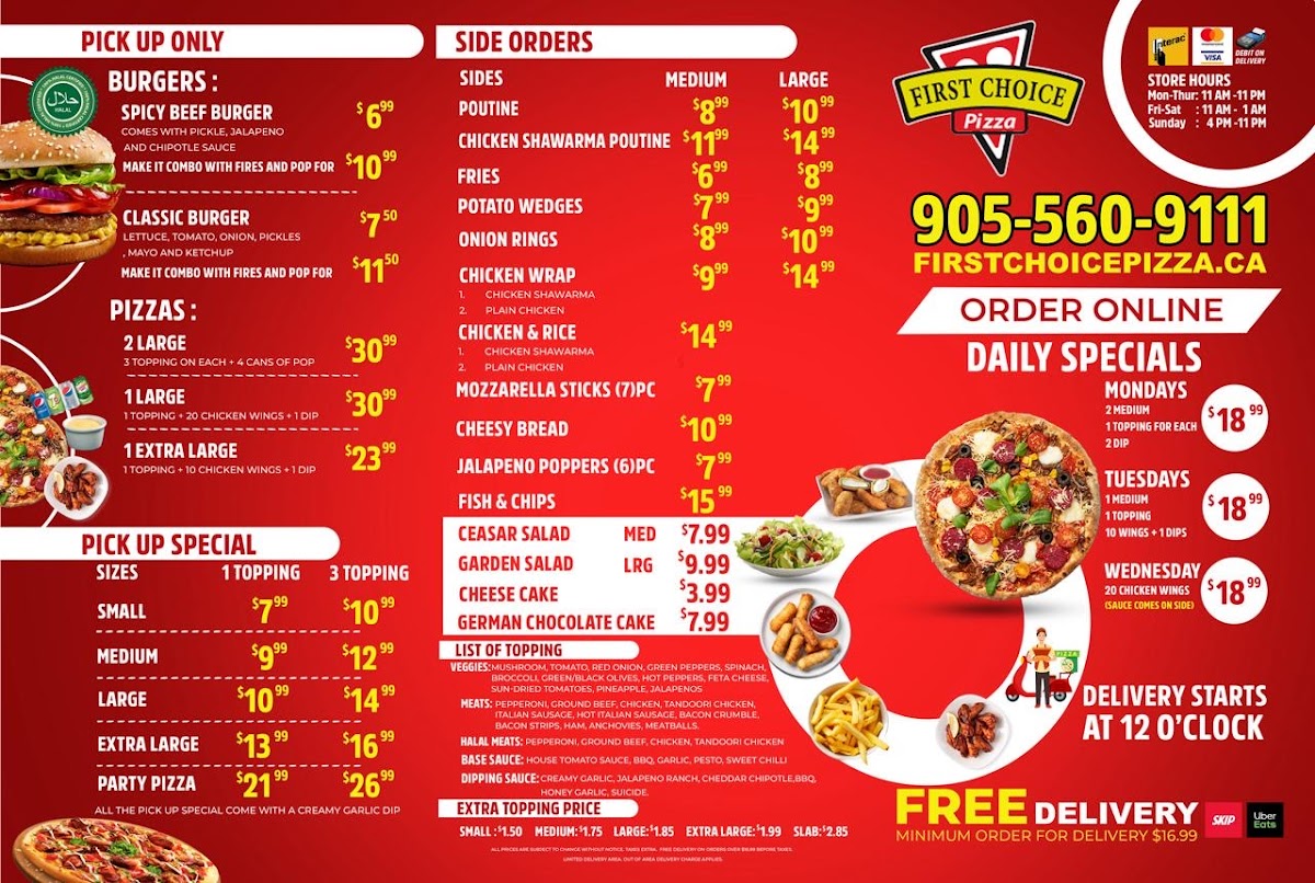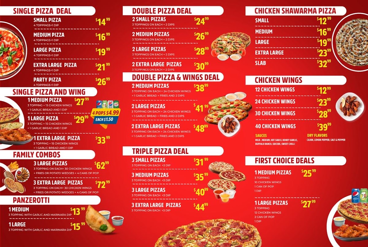 Pizza lovers will find much to enjoy, with the Chicken Shawarma Pizza offering a unique twist on the traditional pizza. Topped with seasoned chicken and shawarma-inspired spices, it’s an irresistible fusion of flavors. Another popular choice is the Small Pizza Half Pepperoni, a classic pizza that satisfies those who enjoy the simplicity of a half-and-half topping. Whether you’re looking for a quick snack or a full meal, First Choice Pizza’s menu has something to please every palate.